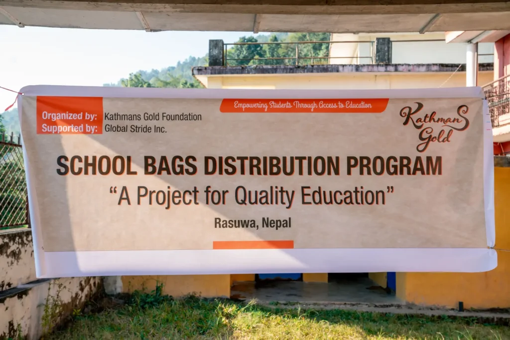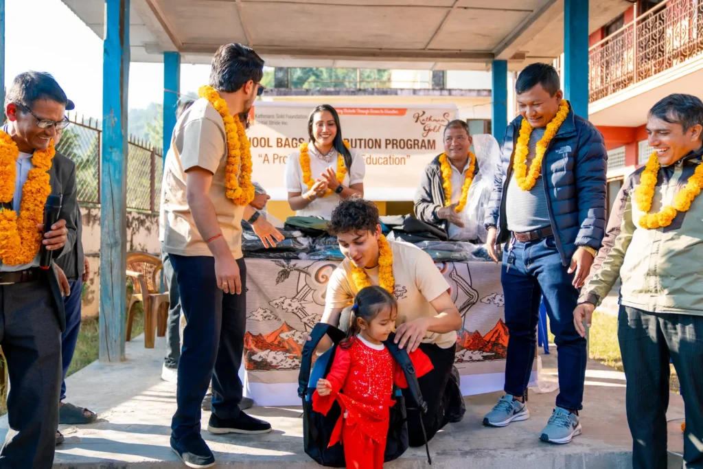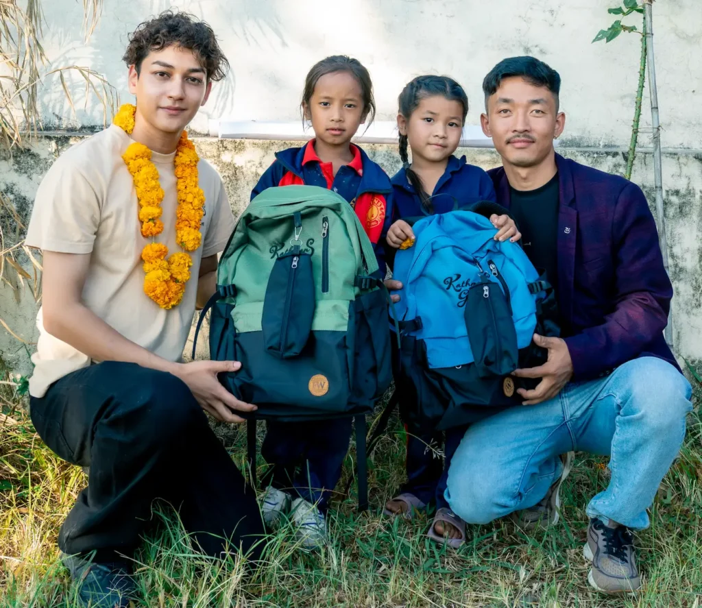 Kathmans Goldでは、ブランド売上の一部を活用し、ネパール山岳地域の農村部に暮らす子どもたちへ、オリジナルのスクールバッグを寄付しました。